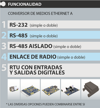 El conversor de medios y RTU que forma parte de la línea PUZZLE (vínculo) es un dispositivo que puede ser utilizado de dos formas diferentes o como una combinación de ambas: la primera es como conversor de medios - para cambiar de medios en redes de comunicaciones de datos - y la segunda como RTU con entradas y salidas digitales. El principal puerto de acceso es ETHERNET y del otro extremo se pueden instalar puertos del tipo RS-232, R5-485, R5-485 AISLADOS, RF o puertos de entrada o salida DIGITAL opto-a islados. El módulo base no incluye puertos instalados.