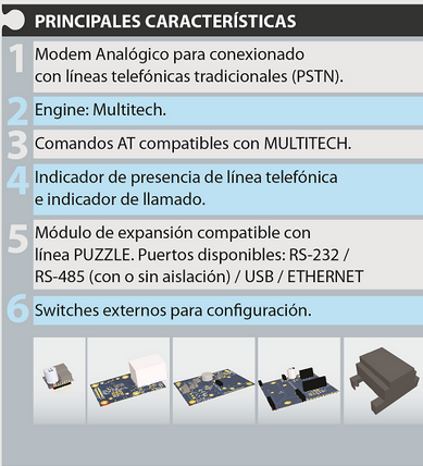 Este dispositivo cuenta con importantes innovaciones con respecto a los módems tradicionales: la protección de línea, indicador de presencia de línea y múltiples puertos de comunicación compatibles con la línea PUZZLE RS-232/RS-485 (con o sin aislación) USB / ETHERNET. El módulo base no incluye puertos instalados.
